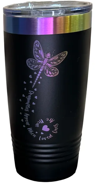 The Dragonfly Prism Tumbler shimmers with iridescent engraving and heartfelt words — a radiant keepsake honoring loved ones while keeping your drink at the perfect temperature.