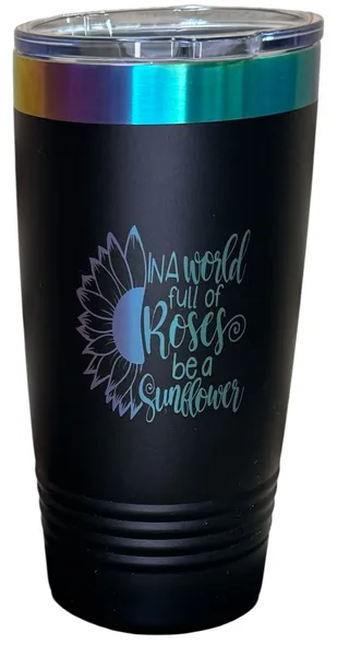 Brighten your day with the uplifting “In a World Full of Roses, Be a Sunflower” Prism Tumbler — a perfect blend of style, positivity, and everyday function. Crafted with durable stainless steel and a radiant prism rim, this tumbler features a laser-engraved sunflower design paired with an inspiring quote that encourages individuality and confidence. The engraving shimmers with iridescent hues of blue, lavender, and aqua that shift with the light, adding a graceful sparkle to your morning coffee or evening tea. With double-wall insulation to keep your drinks hot or cold for hours, it’s both beautiful and practical — a daily reminder to stand tall and shine bright wherever life takes you.